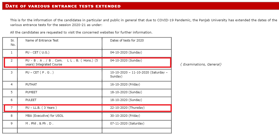 The university informs that, " This is for the information of the candidates in particular and public in general that due to COVID-19 Pandemic, the Panjab University has extended the dates of the various entrance tests for the session 2020-21 as under: