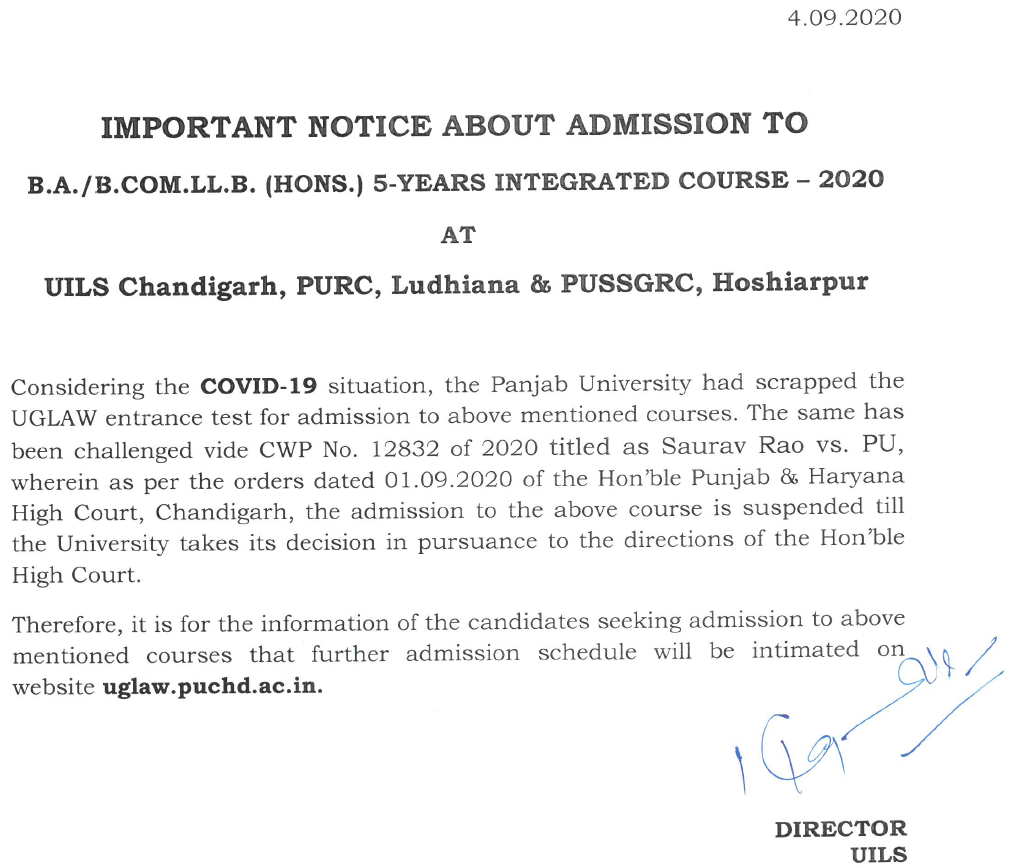 "Considering the COVID-19 situation, Panjab University had scrapped the UGLAW entrance test for admission to above-mentioned courses. The same has been challenged vide CWP No. 12832 of 2020 titled as Saurav Rao vs. PU, wherein as per the orders dated 01.09.2020 of the Hon'ble Punjab & Haryana High Court, Chandigarh, the admission to the above course is suspended till the University takes its decision in pursuance to the directions of the Hon'ble High Court. Therefore, it is for the information of the candidates seeking admission to above-mentioned courses that further admission schedule will be intimated on website uglaw.puchd.ac.in."