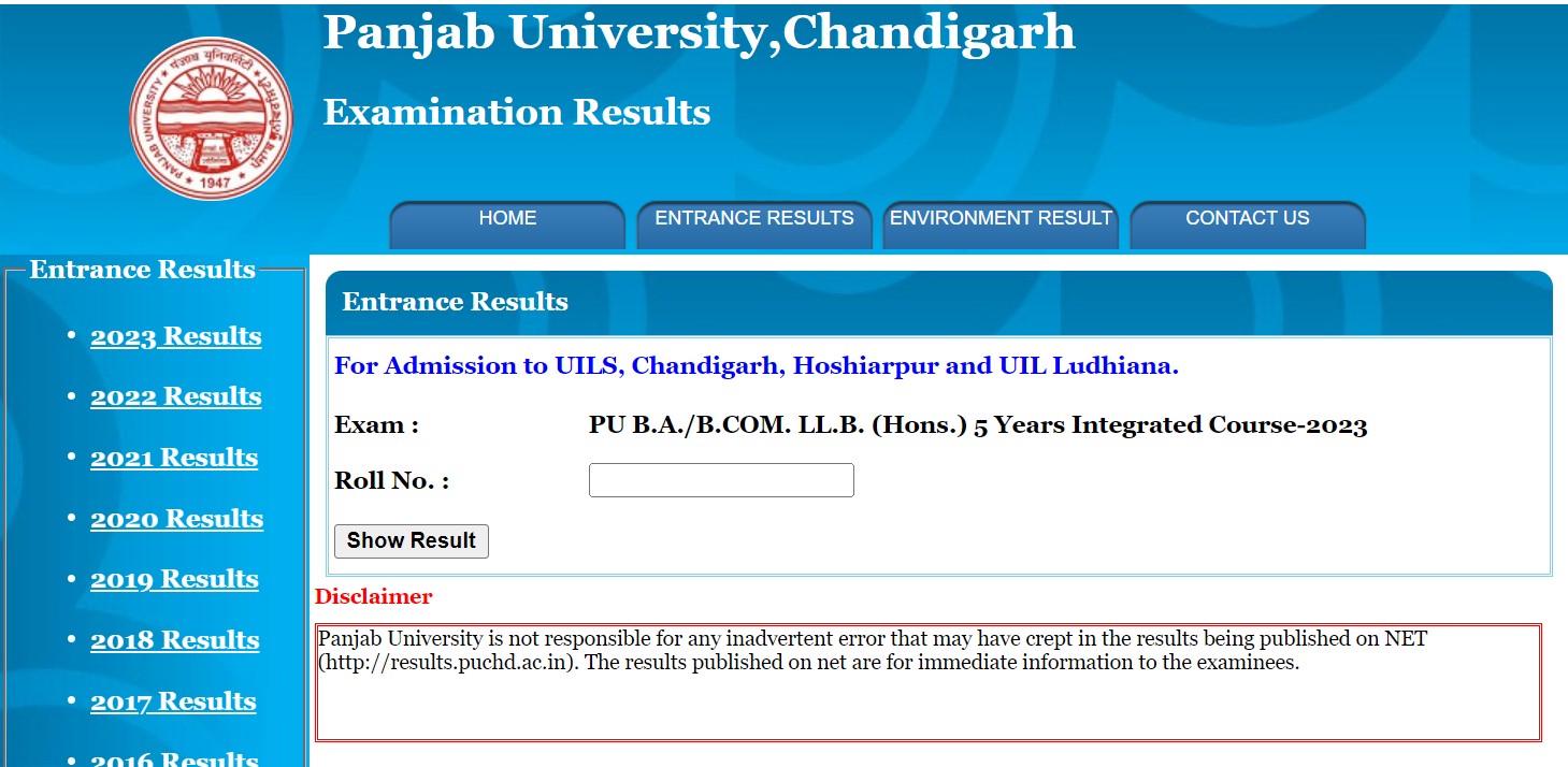 - Visit the PU UGLAW exam website at uglaw.puchd.ac.in, or go to the PU exam result page, results.puchd.ac.in. You can also click on this direct result link, https://results.puexam.in/ShowCurrentEntranceResult.aspx.