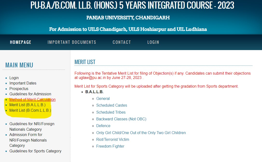 How to Check PU UGLAW 2023 Tenative Merit List?
