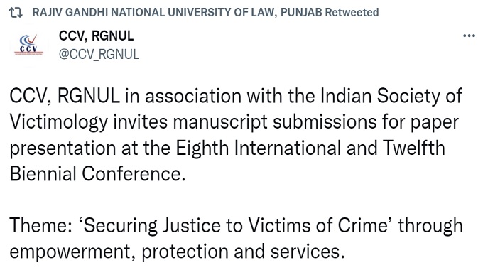 CCV, RGNUL tweeted, "CCV, RGNUL in association with the Indian Society of Victimology invites manuscript submissions for paper presentation at the Eighth International and Twelfth Biennial Conference. Theme: ‘Securing Justice to Victims of Crime’ through empowerment, protection and services."