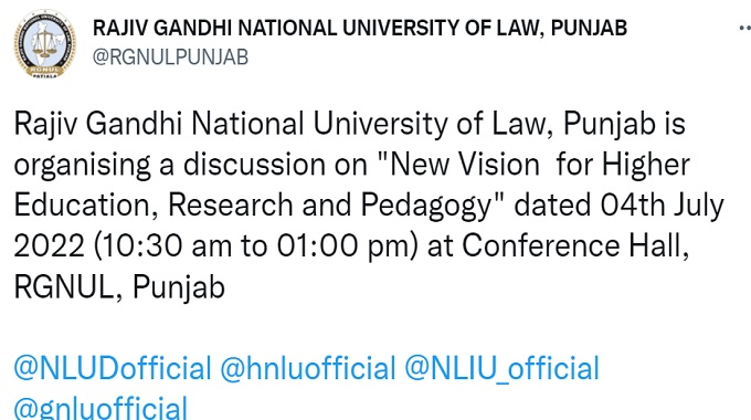RGNUL tweet reads, "Rajiv Gandhi National University of Law, Punjab is organising a discussion on "New Vision for Higher Education, Research and Pedagogy" dated 04th July 2022 (10:30 am to 01:00 pm) at Conference Hall, RGNUL, Punjab"