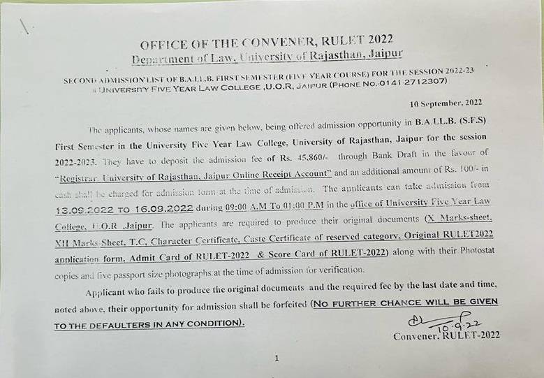 The exam authority issued a notification for RULET 2022 second admission list mentioning, "The applicants whose names are given below, being offered admission opportunity in B.A.LL.B. (S.F.S) First Semester in the University five Year College, University of Rajasthan, Jaipur for the session 2022-2023. They have to deposit the admission fee of Rs. 45.860/- through Bank Draft in the favour of 'Registrar, University of Raiasthan, Jaipur Online Receipt Account" and an additional amount of Rs. 100 in cash shall be charged for admission form at the time of admission. The applicants can take admission from 13.09.2022 TO 16.09.2022 during 09:00 AM To 01:00 PM in the office of University Five Year College UOR, Jaipur. The applicants are required to produce their original documents (X Mark-sheet. XII Mark Sheet. T.C. Character Certificate. Caste Certificate of reserved category. Original RULET 2022 application form. Admit Card of RULET-2022 & Score Card of RULET-2022) along with their Photostat copies and five passport size photographs at the time of admission for verification.