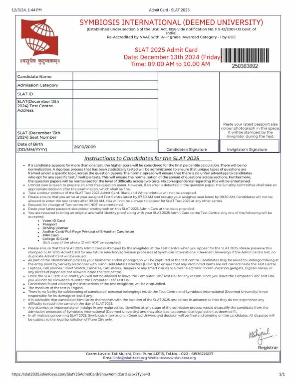 The Symbiosis International University (SIU) released the SLAT 2026 Admit Card for Slot 1 on December 11, 2025. The SLAT admit card carries the candidate’s name, roll number, exam date, time, exam center details and other exam day guidelines. Candidates must note that without a photo ID proof and SLAT Hall Tikcet 2026 no entry will be given.