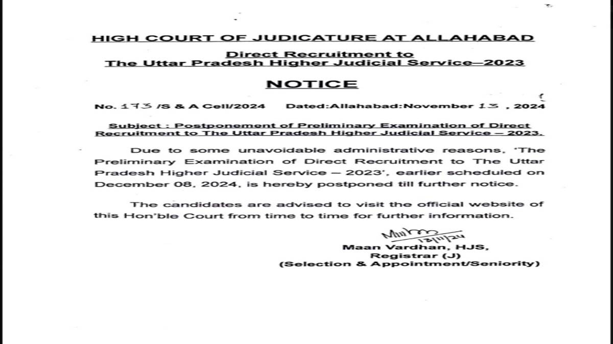 UPHJS 2023: The Allahabad High Court has announced the postponement of the Preliminary Examination for the Uttar Pradesh Higher Judicial Service (UPHJS) 2023. Originally UPHJS Exam 2023 was scheduled for December 8, 2024, the exam has been deferred due to unavoidable administrative reasons.
