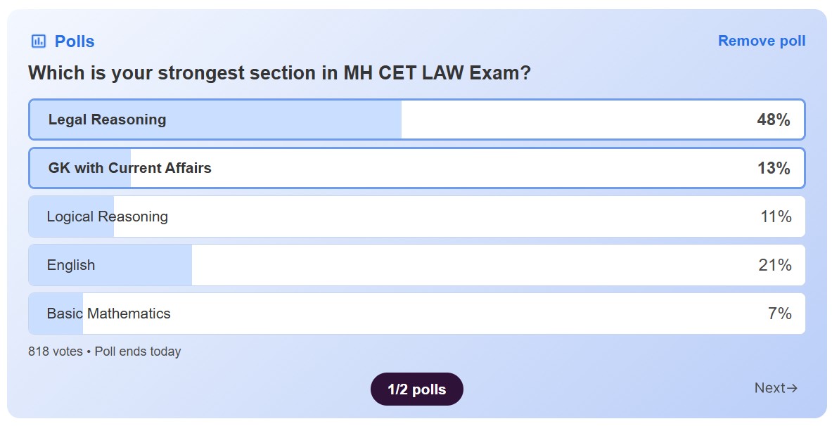 As the MH Law CET exam approaches, students get concerned about focusing more on the scoring sections rather than on the less important ones. Here, Shiksha Polls reveals the scoring section of the Maharashtra Law CET 2025 exam.