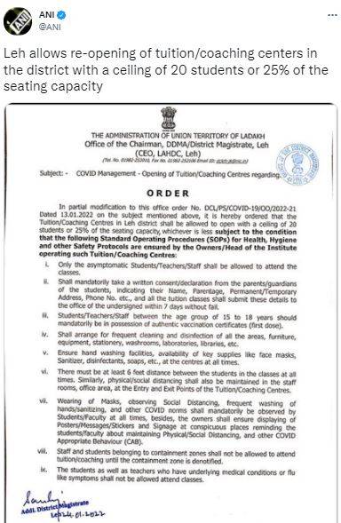 Considering a decrease in the number of novel coronavirus cases, the tuition/ coaching centres in Leh have been allowed to reopen. However, the seating capacity has to remain 20 students (25 per cent) only as a precautionary against COVID-19 spread. The official order released by Ladakh district administration informs,"Only the asymptomatic students/ teachers/ staff shall be allowed to attend the classes.”