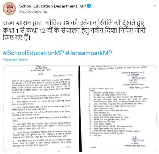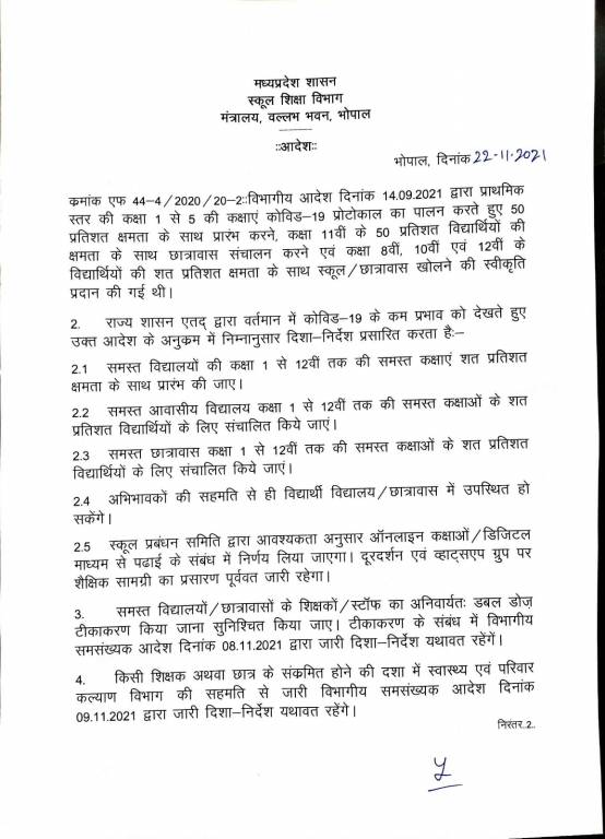 MP School Reopening: In view of the declining number of COVID-19 cases in the state, the Madhya Pradesh government has announced the reopening of schools for all classes with 100 percent capacity. Earlier, the government allowed school reopening with 50 percent capacity for Classes 1 to 5 and with 100 percent capacity for Classes 8, 10 and 12. The revised orders released by School Education Department states that the offline teaching and learning process can now commence along with other learning activities with 100 percent capacity for Classes 1 to 12. The government has also allowed residential schools and hostels to reopen with full capacity. However, parental consent is required to attend schools and stay at hostels.