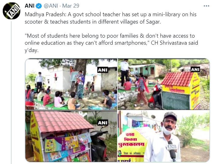 Madhya Pradesh government school teacher of Sagar district established a mini-school and library on his scooter to teach students whose schools have been shut due to the COVID-19 pandemic. With his mini-library on his scooter, Sagar Chandra Shrivastava moves around the villages and can be seen teaching kids in his outdoor class under the shade of a tree.