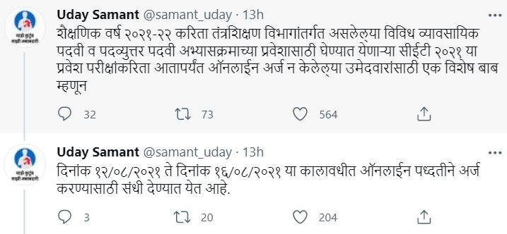 Higher Education Minister Uday Samant announced the reopening of MHT CET application form via his Twitter handle. The minister said, “As a special case for the candidates who have not yet applied online for the CET 2021 entrance examinations for admission to various professional degree and postgraduate courses under the Department of Technical Education for the academic year 2021-22, [students will be provided with an] opportunity to apply online from 12/08/2021 to 16/08/2021.”
