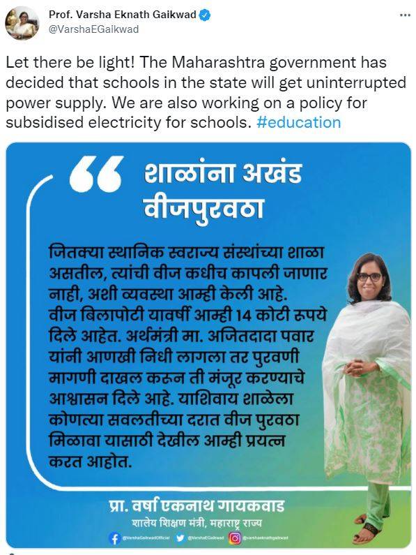 Sharing the good news through her official Twitter account, Gaikwad said that she has also shared that the state government has allocated INR 14 crore towards the pending electricity bills of the schools.
