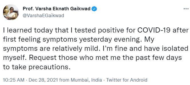 Maharashtra School Education Minister Varsha Eknath Gaikwad tests positive for COVID19 with mild symptoms. The minister informed about her condition via her official Twitter account. The tweet posted by the Maharashtra education minister reads, “I learned today that I tested positive for COVID-19 after first feeling symptoms yesterday evening. My symptoms are relatively mild. I'm fine and have isolated myself. Request those who met me the past few days to take precautions.” Check her official tweet below: