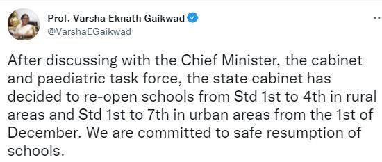 The minister wrote, “After discussing with the Chief Minister, the cabinet and pediatric task force, the state cabinet has decided to re-open schools from Std 1st to 4th in rural areas and Std 1st to 7th in urban areas from the 1st of December. We are committed to the safe resumption of schools.”