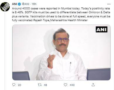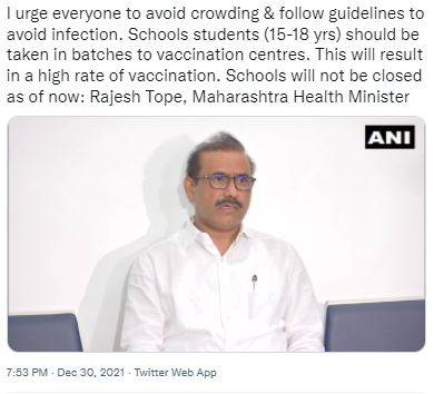The tweet from ANI reads, "I urge everyone to avoid crowding & follow guidelines to avoid infection. Schools students (15-18 yrs) should be taken in batches to vaccination centres. This will result in a high rate of vaccination. Schools will not be closed as of now: Rajesh Tope, Maharashtra Health Minister."