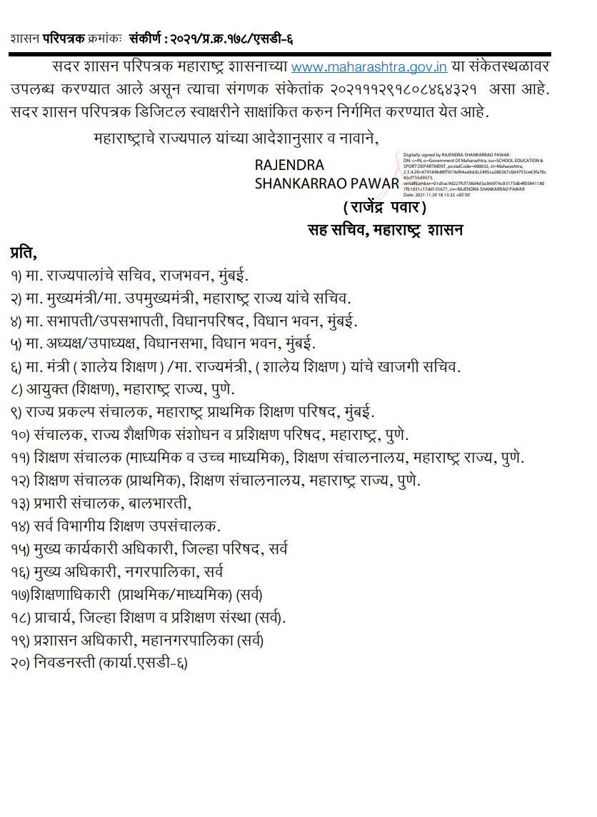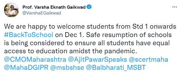 Informing the students and parents regarding the formed SoPs, state education minister Varsha Gaikwad a communique on Twitter stating "We are happy to welcome students from Std 1 onwards #BackToSchool on Dec 1. Safe resumption of schools is being considered to ensure all students have equal access to education amidst the pandemic. "