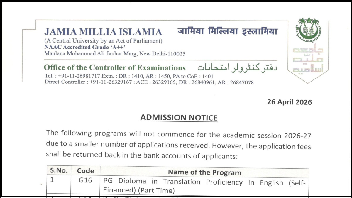 Jamia Millia Islamia has released an official notice stating that the university will be discontinuing certain courses for 2026-27 admission cycle due to less number of applications received for them. Along with this, Jamia also assures that candidates who applied for some of the courses will get their application fee back in their bank accounts, while for other courses, JMI will offer direct admission without test. Read below to know more about this notice.