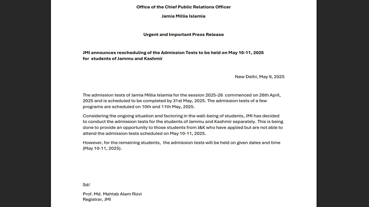 In light of the recent military unrest along the India-Pakistan border, JMI will hold admission tests scheduled on May 10 & 11, 2025, later for J&K students. Learn more below.