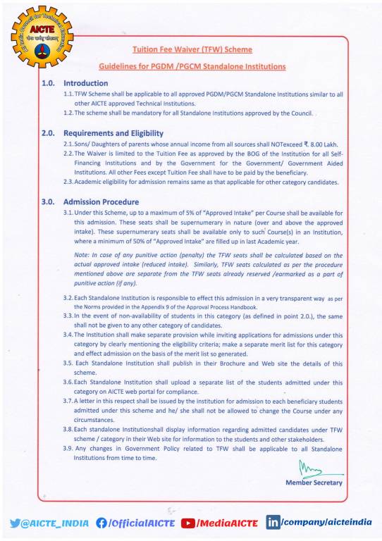 AICTE has directed all the Standalone Institutions to effect admission under TFW Scheme in a very transparent way as per the Norms provided in Appendix 9 of the Approval Process Handbook.