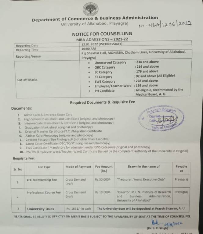 Candidates have to report for counselling exactly at 10 am. The students will have to report at Raj Shekhar Hall, Monirba, Chatham Lines, University of Allahabad, Prayagraj. According to the official circular released by the University, seats shall be allotted strictly on merit basis subject to the availability of seat at the time of counselling.