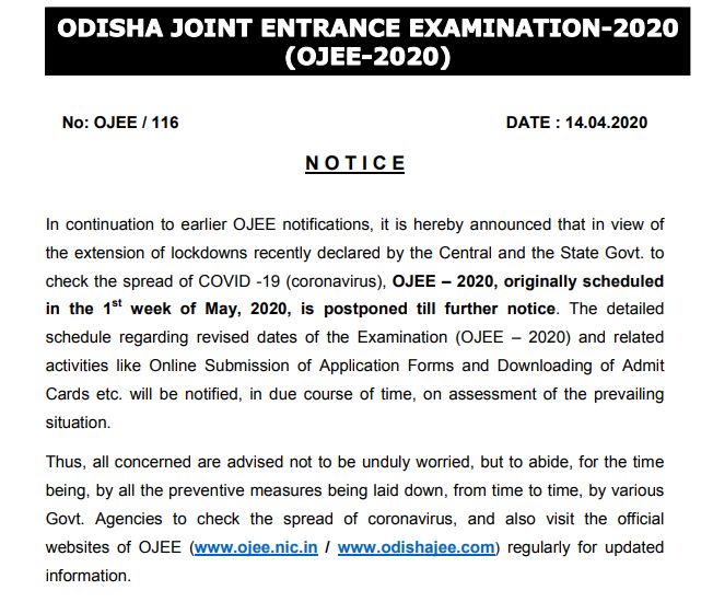 According to the official notification on the official website, OJEE registration 2020 has been extended again amidst the Coronavirus outbreak. The exam dates have also been extended yet again after the extension of the lockdown announced by the Central and State government. Candidates can register for OJEE 2020 on the official website. The last date of fee payment has also been extended. The OJEE 2020 exam was scheduled to be conducted in the first week of May, but after the extension of the countrywide lockdown, revised dates will be released on the website.