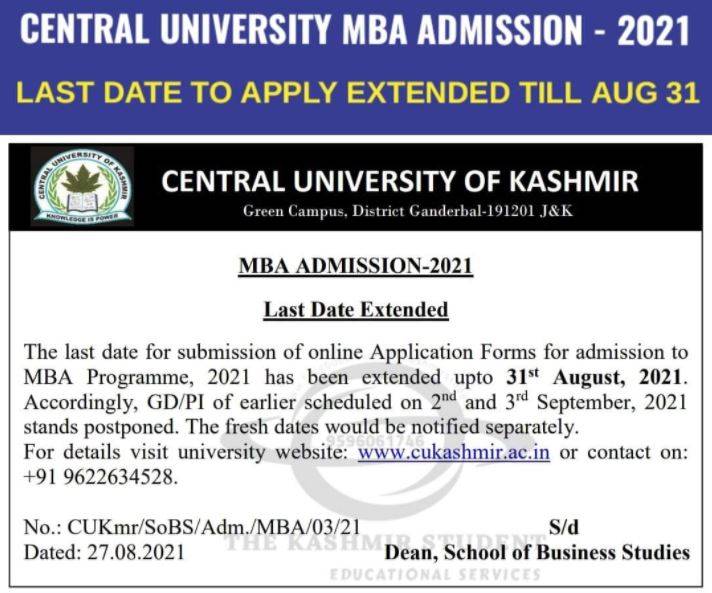 CUK Admissions 2021: The last date to submit the admission application process for management courses at the Central University of Kashmir has been extended. “The last date for submission of online Application Forms for admission to MBA Programme (2021) has been extended up to 31st August 2021. Accordingly, GD/PI early scheduled for 2nd & 3rd September 2021 stands postponed. Fresh details will be notified separately,” reads the official notice released by CUK on August 27. Candidates interested in CUK Admissions 2021 must note the last date to submit applications is now August 31, 2021. Earlier, the University extended the deadline until Augsut 26. The University has offered a total of 46 seats for the programme. No applications will be accepted with the deposition of the application fee. For general category candidates, the application fee is Rs 500. For candidates under SC, ST, OBC and EWS category, the application fee is Rs 250.
