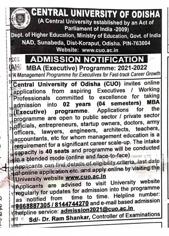 The Central University of Odisha invites applications from aspiring executives and working professionals committed to excellence for its two-year MBA (Executive) programme.