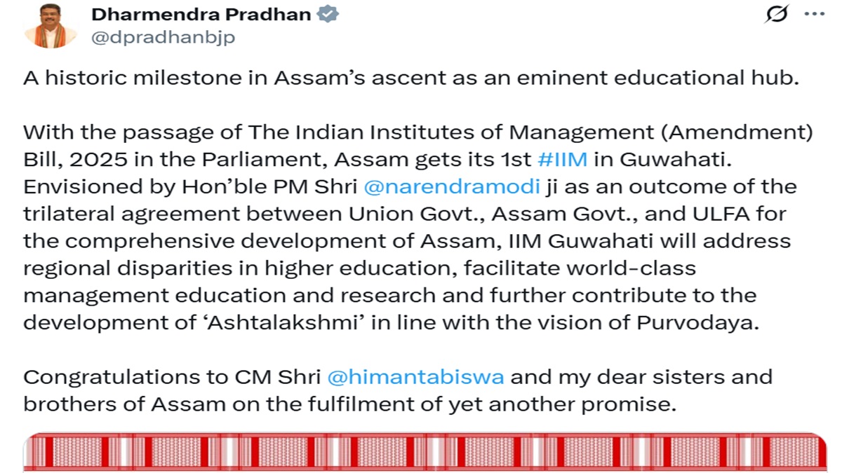 Education Minister Dharmendra Pradhan has praised the passage of the IIM Amendment Bill enabling IIM Guwahati's establishment. ₹555 crore has been approved to boost higher education in Northeast India, with mentorship from IIM Ahmedabad.