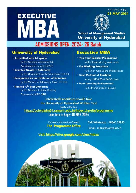 Hyderabad University Admission 2024: Hyderabad University is inviting applications for admission to the Executive MBA programme. Candidates interested in the varsity’s executive MBA may submit their forms at https://uohydadm24.samarth.edu.in/index.php/registration/user/register The last date to apply for Hyderabad University Executive MBA Admission 2024 is May 1.