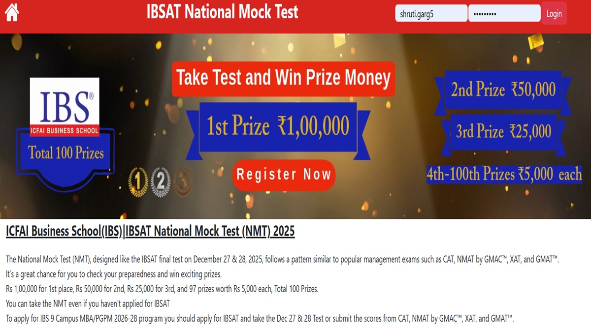 ICFAI Business School (IBS) has announced the IBSAT National Mock Test (NMT) 2025 schedule at ibsat-mocktest.ibsindia.org. The IBSAT mock test 2025 will be held between August 28 and December 13, 2025. Candidates preparing for the IBSAT exam 2025 can now check the complete schedule for the mock test and get a chance to win the INR 1 lakh as prize money.