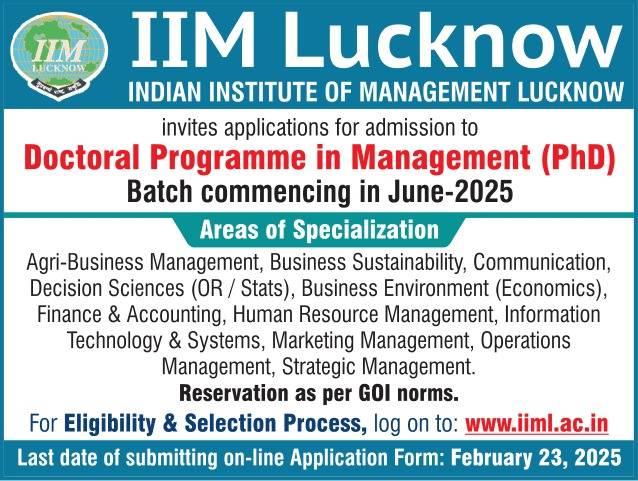 The Indian Institute of Management Lucknow (IIM Lucknow) is inviting applications for its Doctoral Programme in Management (PhD) for the batch commencing in June 2025. Last date to apply for IIM Lucknow PhD Admission 2025 is February 23. On this page, get details on eligibility criteria, age limit, selection process, and more.