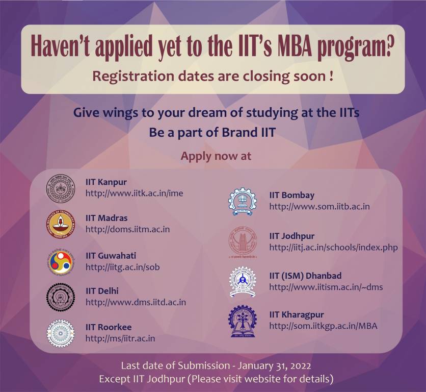 IIT MBA Admissions 2022: Top Indian Institutes of Technology (IITs) offering Master of Business Administration (MBA) programmes are conducting admissions for the upcoming session. Candidates must note that the registration window for IIT MBA Admissions 2022 is all set to close on January 31 (except for IIT Jodhpur). The last date to apply for IIT Jodhpur MBA admissions 2022 is February 28, 2022. Common Admission Test (CAT 2021) qualified candidates interested in IIT MBA admissions 2022 can apply online by visiting independent websites of the institutes. Eligible aspirants are required to apply to different IITs on their respective websites by filling up application forms and submitting scanned copies of required documents.