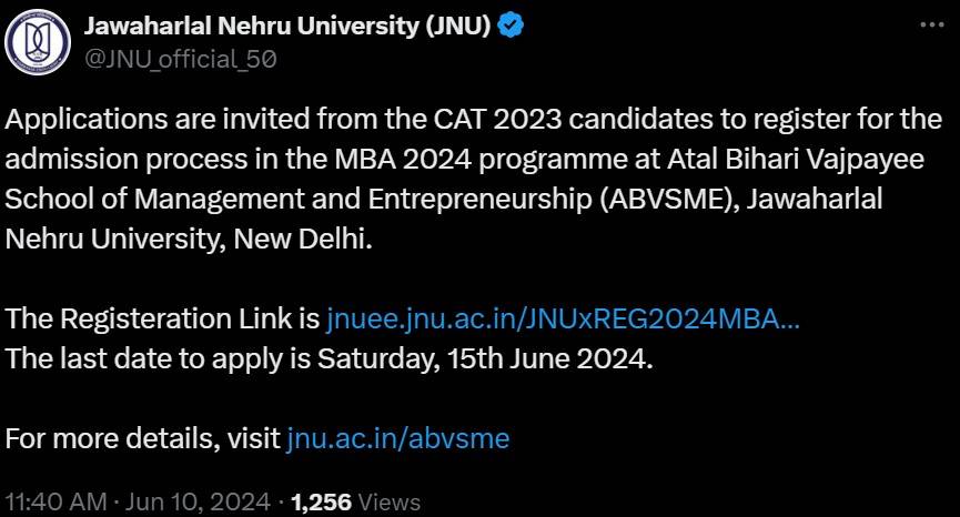 In an official post on X, the institute has informed, “Applications are invited from the CAT 2023 candidates to register for the admission process in the MBA 2024 programme at Atal Bihari Vajpayee School of Management and Entrepreneurship (ABVSME), Jawaharlal Nehru University, New Delhi. The Registeration Link is https://jnuee.jnu.ac.in/JNUxREG2024MBAjan/Regprocess.aspx