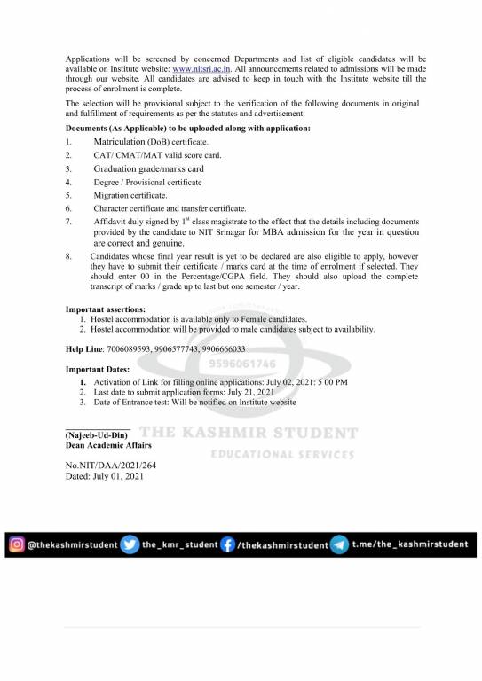 Applicants interested in NIT Srinagar Admissions 2021 for MBA programmes must note that the institute activated the online admission form link on July 2, 2021. The last date to submit the applications for NIT Srinagar MBA admissions 2021 is July 21, 2021.