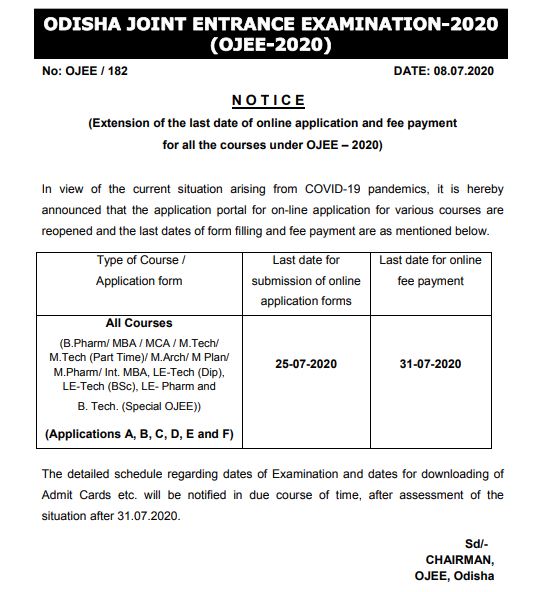 | Last date to apply for Special OJEE for B.Tech (reopened) | 25-Jul-2020 |