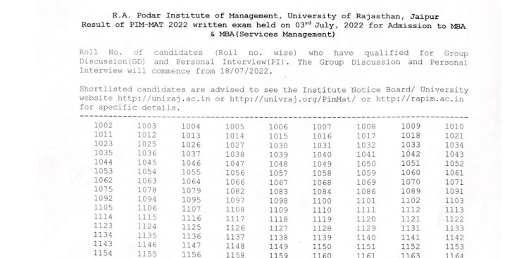 R.A. Podar Institute of Management, University of Rajasthan has announced the result for PIM MAT 2022. Candidates who have appeared for the entrance exam can now check their results online. The PIM MAT result 2022 has been released in a form of a merit list. The list mentions the roll number of the candidates who have qualified for the group discussion and personal interview rounds.