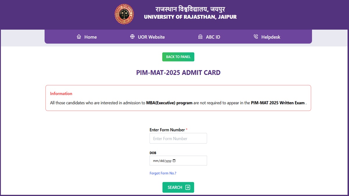 University of Rajasthan, Jaipur, has released the PIM MAT 2025 admit card. Registered candidates can now download the PIM MAT hall ticket online by entering the login details- form number and date of birth. Candidates must note that PIM MAT admit card 2025 is an important document that has to be carried on the day ofthe examination. University of Rajasthan, Jaipur will conduct PIM MAT 2025 exma on June 8, 2025.