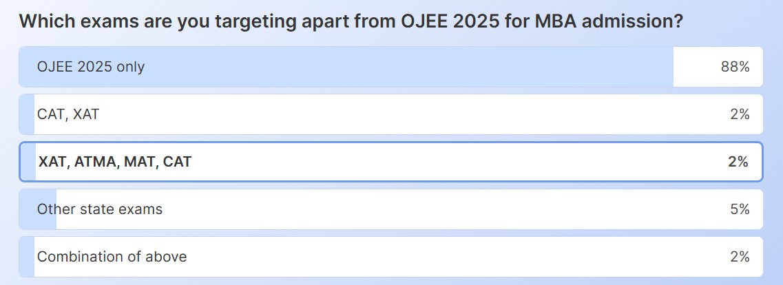 A recent poll was conducted for the MBA aspirants appearing for OJEE exam 2025. The poll reveals that majority of the OJEE applicants are inclined towards Odisha Joint Entrance Exam (OJEE), with a staggering 88% of aspirants opting only for the OJEE exam 2025. This showcases the students’ preferences for MBA colleges accepting OJEE scores.