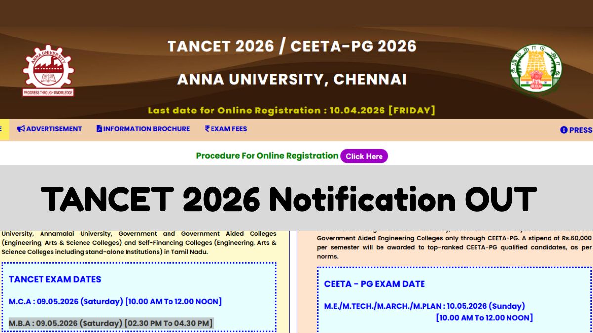Anna University has released TANCET 2026 notification with exam date, and registration schedule. TANCET 2026 registration will start from March 16. Last date to apply for TANCET 2026 is April 10.