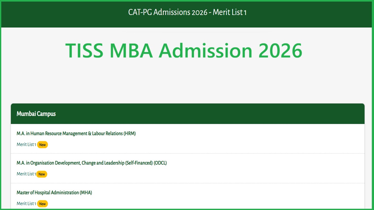 Tata Institute of Social Science, Mumbai has released the TISS MBA amdission 2026 merit list through CAT scores. Candidates who appeared for the CAT 2025 exam and TISS MBA 2026 selection rounds can now download the merit list for M.A. in Human Resource Management & Labour Relations (HRM), M.A. in Organisation Development, Change and Leadership (Self-Financed) (ODCL), and Master of Hospital Administration (MHA). Check steps to download the TISS MBA admission 2026 merit list here.