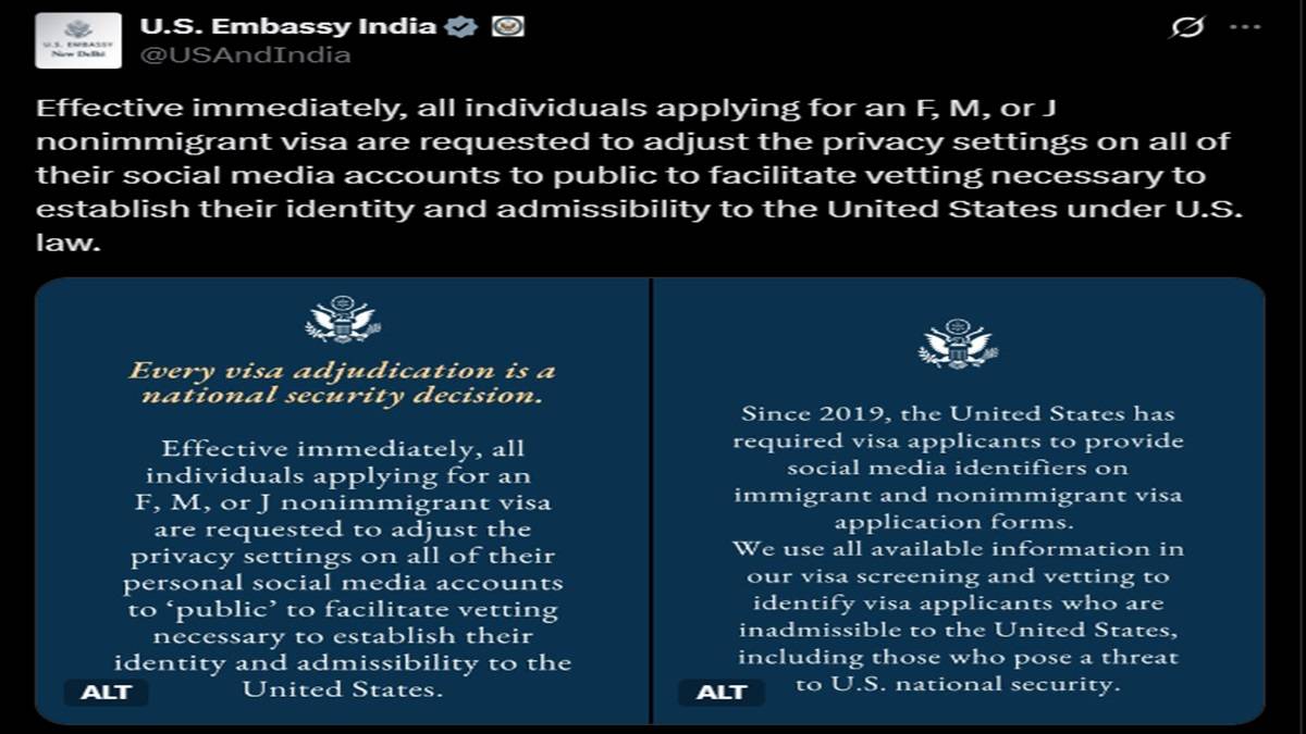 In a move set to impact thousands of Indian students and exchange visitors, the US Embassy in India has made it mandatory for all F, M, and J non-immigrant visa applicants to ensure their social media profiles are publicly visible. The announcement, made via an official post on X, is effective immediately.