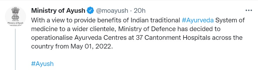 Ministry of AYUSH tweet reads, "With a view to provide benefits of Indian traditional #Ayurveda System of medicine to a wider clientele, Ministry of Defence has decided to operationalise Ayurveda Centres at 37 Cantonment Hospitals across the country from May 01, 2022."