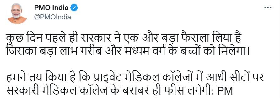 PM Narendra Modi tweet says, "A few days back, the government has taken another big decision, which will benefit the poor and middle-class children. We have decided that half the seats in private medical colleges will be charged at par with government medical colleges."