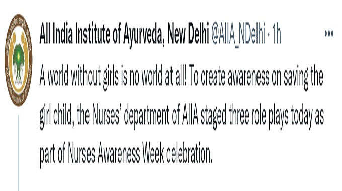 AIIA tweet reads, "A world without girls is no world at all! To create awareness on saving the girl child, the Nurses’ department of AIIA staged three role plays today as part of Nurses Awareness Week celebration."