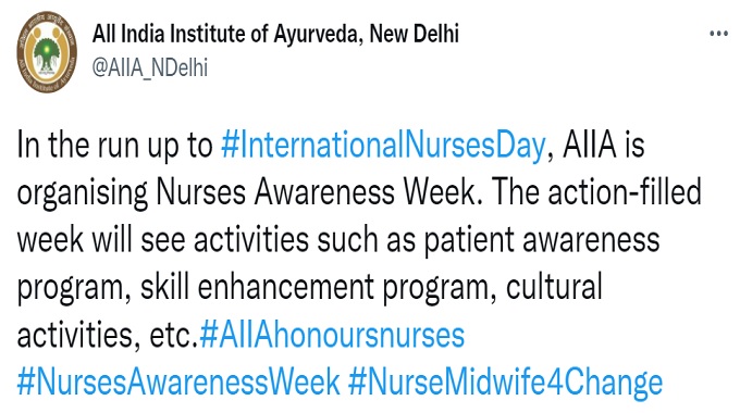 With the international nurses day nearing on May 12, 2022, the All India Institute of Ayurveda (AIIA) is organising Nurses Awareness Week.