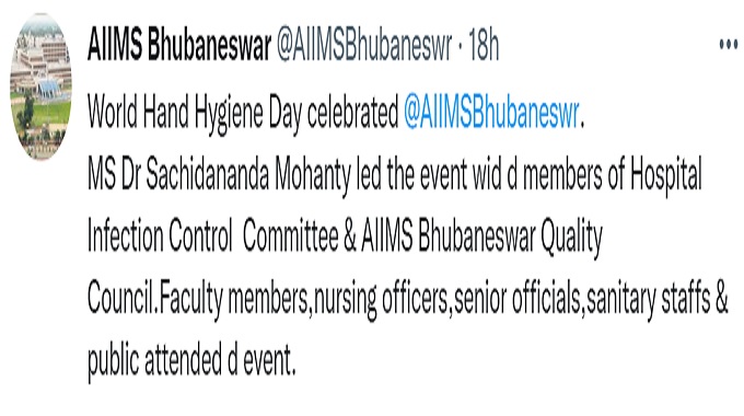 AIIMS Bhubaneswar's tweet reads, "World Hand Hygiene Day celebrated @AIIMSBhubaneswr. MS Dr Sachidananda Mohanty led the event wid d members of Hospital Infection Control Committee & AIIMS Bhubaneswar Quality Council.Faculty members,nursing officers,senior officials,sanitary staffs & public attended d event."