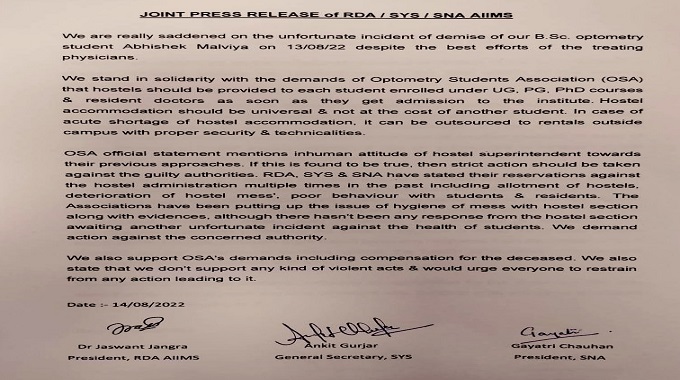 In the press release, the AIIMS RDA/SYS/SNA mentioned that they stand in solidarity with the demands of OSA that hostels should be provided to each student enrolled under UG, PG, and PhD courses & resident doctors as soon as they get admission to the institute.