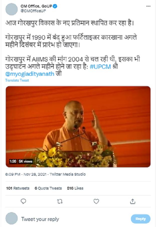 Uttar Pradesh Chief Minister Yogi Adityanath has announced that the All India Institute of Medical Sciences (AIIMS) will be inaugurated in Gorakhpur in December. He also announced that a fertilizer factory that had been kept closed since 1990 will be restarted.