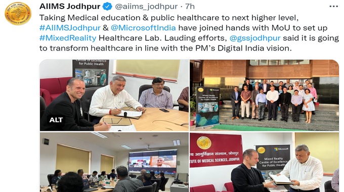 AIIMS Jodhpur's tweet reads, "Taking Medical education & public healthcare to next higher level, AIIMSJodhpur & @MicrosoftIndia have joined hands with MoU to set up #MixedReality Healthcare Lab. Lauding efforts, @gssjodhpur said it is going to transform healthcare in line with the PM’s Digital India vision."