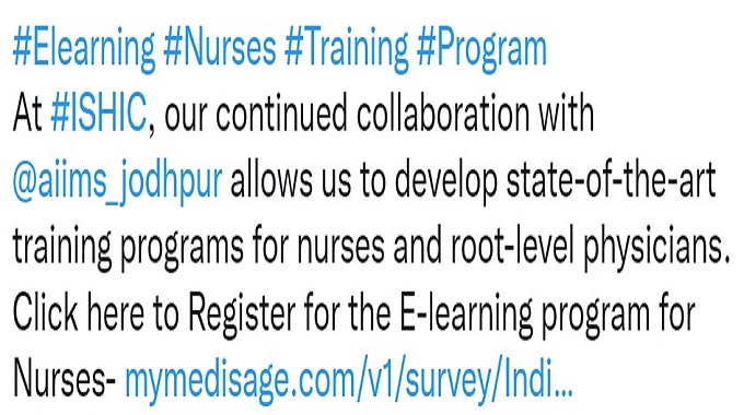 ISHIC tweet reads, "#Elearning #Nurses #Training #Program At #ISHIC, our continued collaboration with @aiims_jodhpur allows us to develop state-of-the-art training programs for nurses and root-level physicians. Click here to Register for the E-learning program for Nurses."