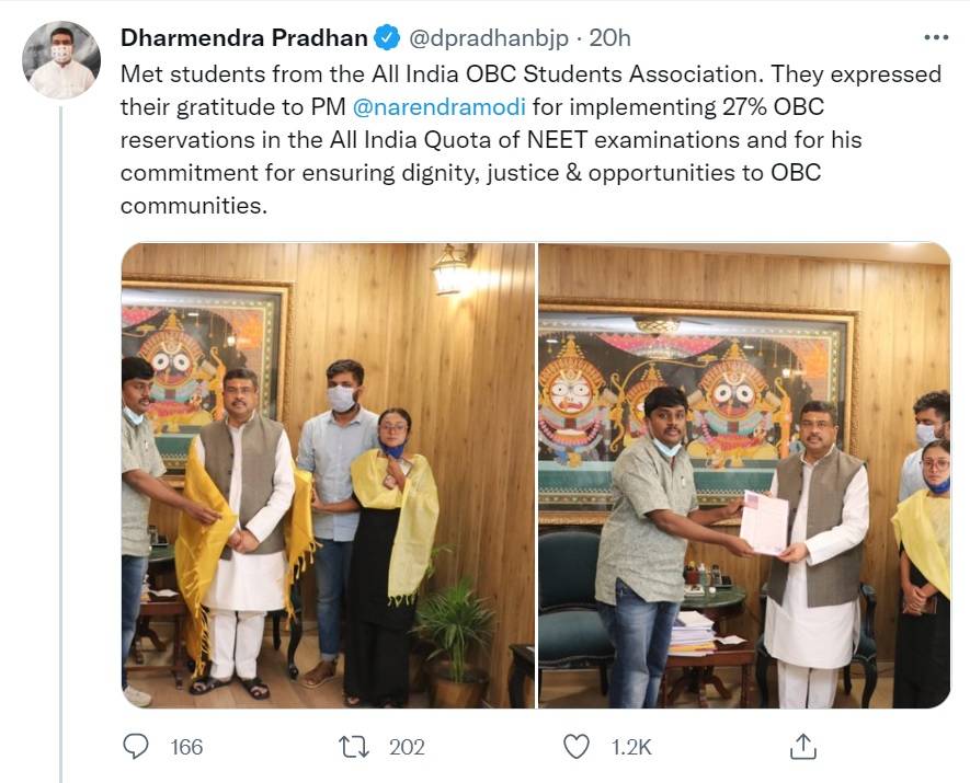 On Monday, Union Education Minister Dharmendra Pradhan met All India Other Backward Class (OBC) Students Association members who thanked him for approving the 27 per cent reservation in the medical entrance exam National Eligibility cum Entrance Test (NEET).